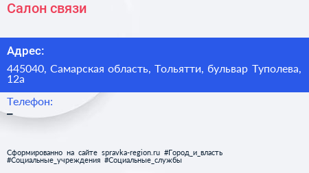 Салон связи по адресу 445040, Самарская область, Тольятти, бульвар Туполева, 12а в дальнейшем Организация, размещена в следующих категориях: