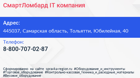 СмартЛомбард, IT-компания по адресу 445037, Самарская область, Тольятти, Юбилейная, 40 в дальнейшем Организация, размещена в следующих категориях: