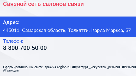 Связной, сеть салонов связи по адресу 445011, Самарская область, Тольятти, Карла Маркса, 57 в дальнейшем Организация, размещена в следующих категориях: