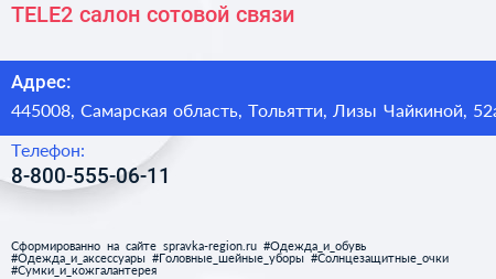 TELE2, салон сотовой связи по адресу 445008, Самарская область, Тольятти, Лизы Чайкиной, 52а в дальнейшем Организация, размещена в следующих категориях: