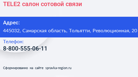 TELE2, салон сотовой связи по адресу 445032, Самарская область, Тольятти, Революционная, 20 в дальнейшем Организация, размещена в следующих категориях: