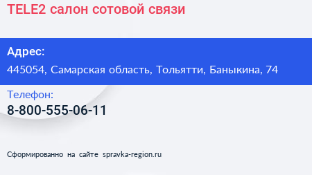 TELE2, салон сотовой связи по адресу 445054, Самарская область, Тольятти, Баныкина, 74 в дальнейшем Организация, размещена в следующих категориях: