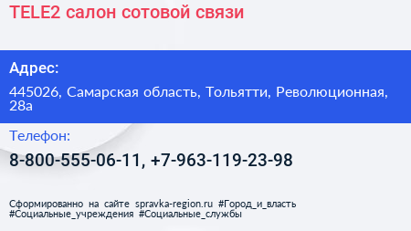 TELE2, салон сотовой связи по адресу 445026, Самарская область, Тольятти, Революционная, 28а в дальнейшем Организация, размещена в следующих категориях: