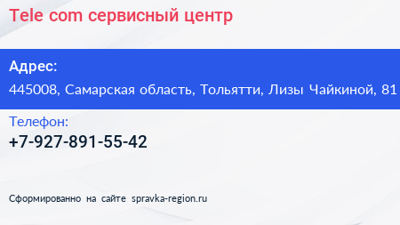 Tele.com, сервисный центр по адресу 445008, Самарская область, Тольятти, Лизы Чайкиной, 81 в дальнейшем Организация, размещена в следующих категориях: