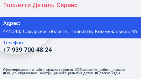 Тольятти Деталь Сервис по адресу 445043, Самарская область, Тольятти, Коммунальная, 46 в дальнейшем Организация, размещена в следующих категориях:
