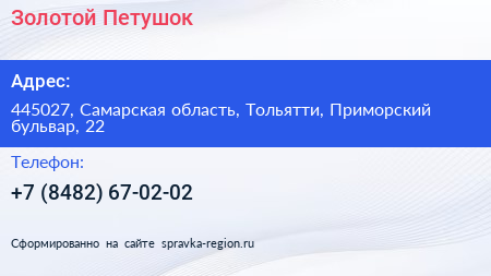 Золотой Петушок по адресу 445027, Самарская область, Тольятти, Приморский бульвар, 22 в дальнейшем Организация, размещена в следующих категориях: