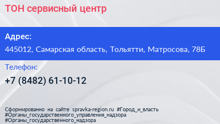 ТОН, сервисный центр по адресу 445012, Самарская область, Тольятти, Матросова, 78Б в дальнейшем Организация, размещена в следующих категориях: