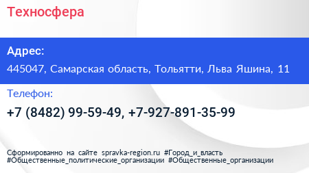 Техносфера по адресу 445047, Самарская область, Тольятти, Льва Яшина, 11 в дальнейшем Организация, размещена в следующих категориях: