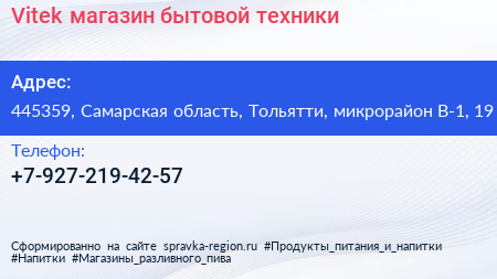 Vitek, магазин бытовой техники по адресу 445359, Самарская область, Тольятти, микрорайон В-1, 19 в дальнейшем Организация, размещена в следующих категориях: