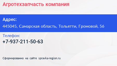 Агротехзапчасть, компания по адресу 445045, Самарская область, Тольятти, Громовой, 56 в дальнейшем Организация, размещена в следующих категориях: