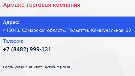 Армакс, торговая компания по адресу 445043, Самарская область, Тольятти, Коммунальная, 39 в дальнейшем Организация, размещена в следующих категориях: