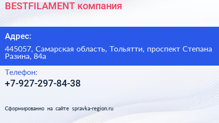 BESTFILAMENT, компания по адресу 445057, Самарская область, Тольятти, проспект Степана Разина, 84а в дальнейшем Организация, размещена в следующих категориях: