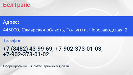 БелТранс по адресу 445000, Самарская область, Тольятти, Новозаводская, 2 в дальнейшем Организация, размещена в следующих категориях: