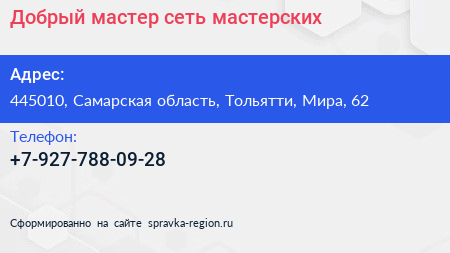 Добрый мастер, сеть мастерских по адресу 445010, Самарская область, Тольятти, Мира, 62 в дальнейшем Организация, размещена в следующих категориях: