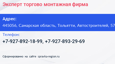 Эксперт, торгово-монтажная фирма по адресу 445056, Самарская область, Тольятти, Автостроителей, 57 в дальнейшем Организация, размещена в следующих категориях: