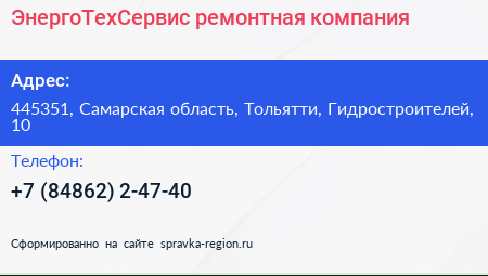 ЭнергоТехСервис, ремонтная компания по адресу 445351, Самарская область, Тольятти, Гидростроителей, 10 в дальнейшем Организация, размещена в следующих категориях: