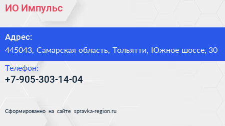 ИО Импульс по адресу 445043, Самарская область, Тольятти, Южное шоссе, 30 в дальнейшем Организация, размещена в следующих категориях: