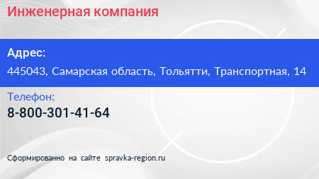 Инженерная компания по адресу 445043, Самарская область, Тольятти, Транспортная, 14 в дальнейшем Организация, размещена в следующих категориях: