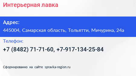 Интерьерная лавка по адресу 445004, Самарская область, Тольятти, Мичурина, 24а в дальнейшем Организация, размещена в следующих категориях: