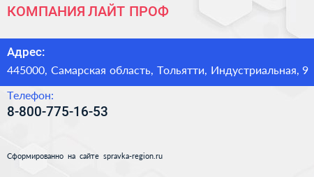 КОМПАНИЯ ЛАЙТ ПРОФ по адресу 445000, Самарская область, Тольятти, Индустриальная, 9 в дальнейшем Организация, размещена в следующих категориях: