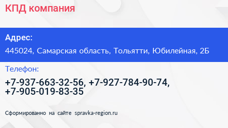 КПД, компания по адресу 445024, Самарская область, Тольятти, Юбилейная, 2Б в дальнейшем Организация, размещена в следующих категориях: