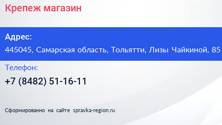 Крепеж, магазин по адресу 445045, Самарская область, Тольятти, Лизы Чайкиной, 85 в дальнейшем Организация, размещена в следующих категориях: