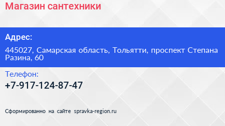 Магазин сантехники по адресу 445027, Самарская область, Тольятти, проспект Степана Разина, 60 в дальнейшем Организация, размещена в следующих категориях: