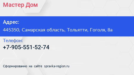 Мастер Дом по адресу 445350, Самарская область, Тольятти, Гоголя, 8а в дальнейшем Организация, размещена в следующих категориях: