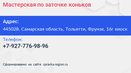 Мастерская по заточке коньков по адресу 445028, Самарская область, Тольятти, Фрунзе, 16г киоск в дальнейшем Организация, размещена в следующих категориях: