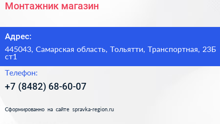 Монтажник, магазин по адресу 445043, Самарская область, Тольятти, Транспортная, 23Б ст1 в дальнейшем Организация, размещена в следующих категориях: