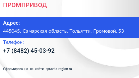 ПРОМПРИВОД по адресу 445045, Самарская область, Тольятти, Громовой, 53 в дальнейшем Организация, размещена в следующих категориях: