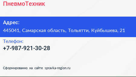 ПневмоТехник по адресу 445041, Самарская область, Тольятти, Куйбышева, 21 в дальнейшем Организация, размещена в следующих категориях: