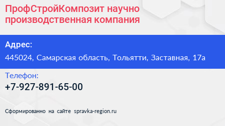 ПрофСтройКомпозит, научно-производственная компания по адресу 445024, Самарская область, Тольятти, Заставная, 17а в дальнейшем Организация, размещена в следующих категориях: