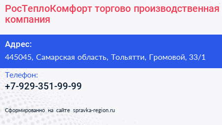 РосТеплоКомфорт, торгово-производственная компания по адресу 445045, Самарская область, Тольятти, Громовой, 33/1 в дальнейшем Организация, размещена в следующих категориях: