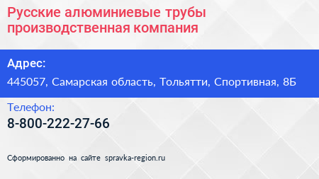 Русские алюминиевые трубы, производственная компания по адресу 445057, Самарская область, Тольятти, Спортивная, 8Б в дальнейшем Организация, размещена в следующих категориях:
