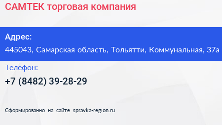 САМТЕК, торговая компания по адресу 445043, Самарская область, Тольятти, Коммунальная, 37а в дальнейшем Организация, размещена в следующих категориях: