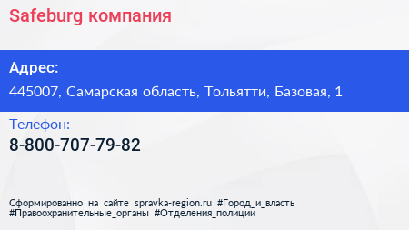 Safeburg, компания по адресу 445007, Самарская область, Тольятти, Базовая, 1 в дальнейшем Организация, размещена в следующих категориях:
