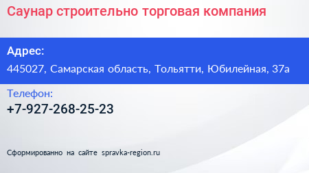 Саунар, строительно-торговая компания по адресу 445027, Самарская область, Тольятти, Юбилейная, 37а в дальнейшем Организация, размещена в следующих категориях: