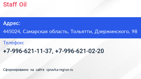 Staff Oil по адресу 445024, Самарская область, Тольятти, Дзержинского, 98 в дальнейшем Организация, размещена в следующих категориях: