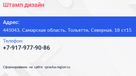 Штамп-дизайн по адресу 445043, Самарская область, Тольятти, Северная, 18 ст15 в дальнейшем Организация, размещена в следующих категориях: