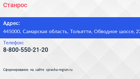 Станрос по адресу 445000, Самарская область, Тольятти, Обводное шоссе, 23 в дальнейшем Организация, размещена в следующих категориях: