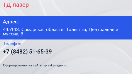 ТД-лазер по адресу 445143, Самарская область, Тольятти, Центральный массив, 8 в дальнейшем Организация, размещена в следующих категориях: