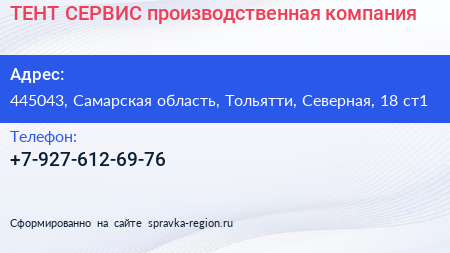 ТЕНТ-СЕРВИС, производственная компания по адресу 445043, Самарская область, Тольятти, Северная, 18 ст1 в дальнейшем Организация, размещена в следующих категориях: