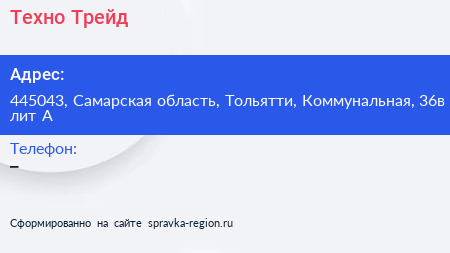 Техно Трейд по адресу 445043, Самарская область, Тольятти, Коммунальная, 36в лит А в дальнейшем Организация, размещена в следующих категориях: