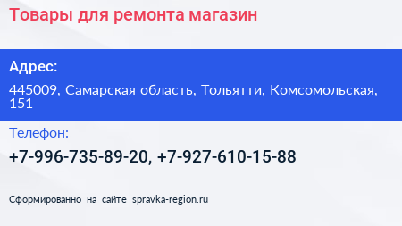 Товары для ремонта, магазин по адресу 445009, Самарская область, Тольятти, Комсомольская, 151 в дальнейшем Организация, размещена в следующих категориях: