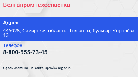 Волгапромтехоснастка по адресу 445028, Самарская область, Тольятти, бульвар Королёва, 13 в дальнейшем Организация, размещена в следующих категориях: