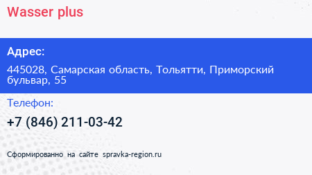 Wasser plus по адресу 445028, Самарская область, Тольятти, Приморский бульвар, 55 в дальнейшем Организация, размещена в следующих категориях: