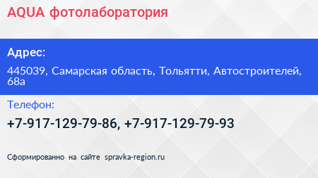 AQUA, фотолаборатория по адресу 445039, Самарская область, Тольятти, Автостроителей, 68а в дальнейшем Организация, размещена в следующих категориях: