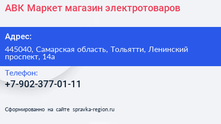 АВК Маркет, магазин электротоваров по адресу 445040, Самарская область, Тольятти, Ленинский проспект, 14а в дальнейшем Организация, размещена в следующих категориях: