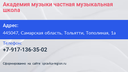 Академия музыки, частная музыкальная школа по адресу 445047, Самарская область, Тольятти, Тополиная, 1а в дальнейшем Организация, размещена в следующих категориях: